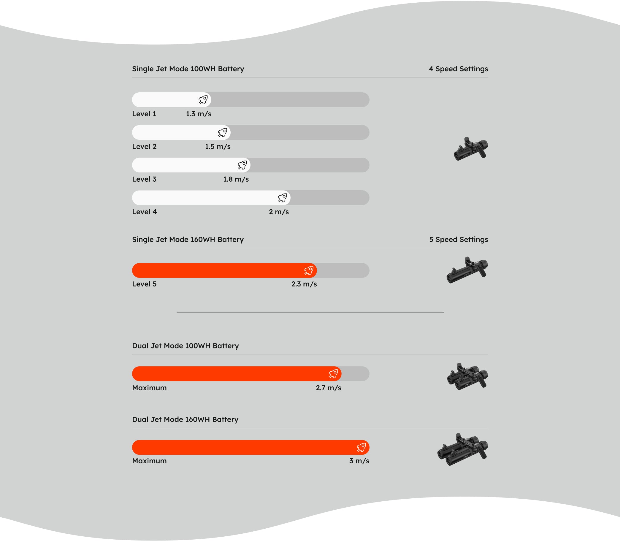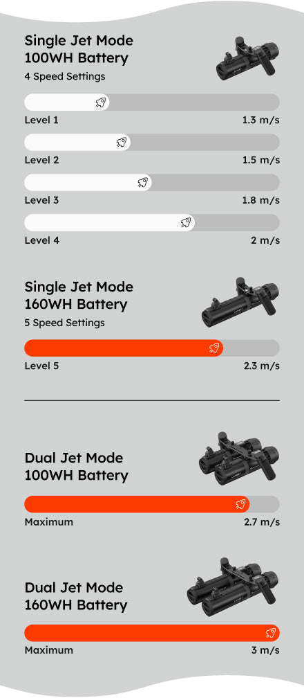 We offer two battery options for our water scooter: the standard 100wh and the XR 160wh. The XR provides a longer runtime and a higher speed level of about 2.3 meters per second (equivalent to 6 miles per hour).